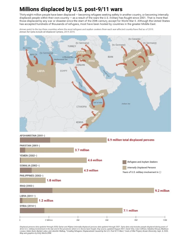Zistili tiež, že v dôsledku týchto vojen vyvolaných USA bolo vysídlených 38 miliónov ľudí. Išlo o najväčšiu utečeneckú krízu od druhej svetovej vojny.